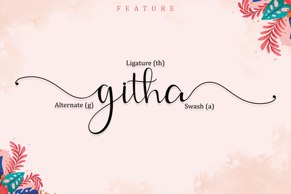 A wide range of swashes (a-z), alternates (a-z) and ligature are included so that you can give your logo or name a custom, hand-calligraphy look.